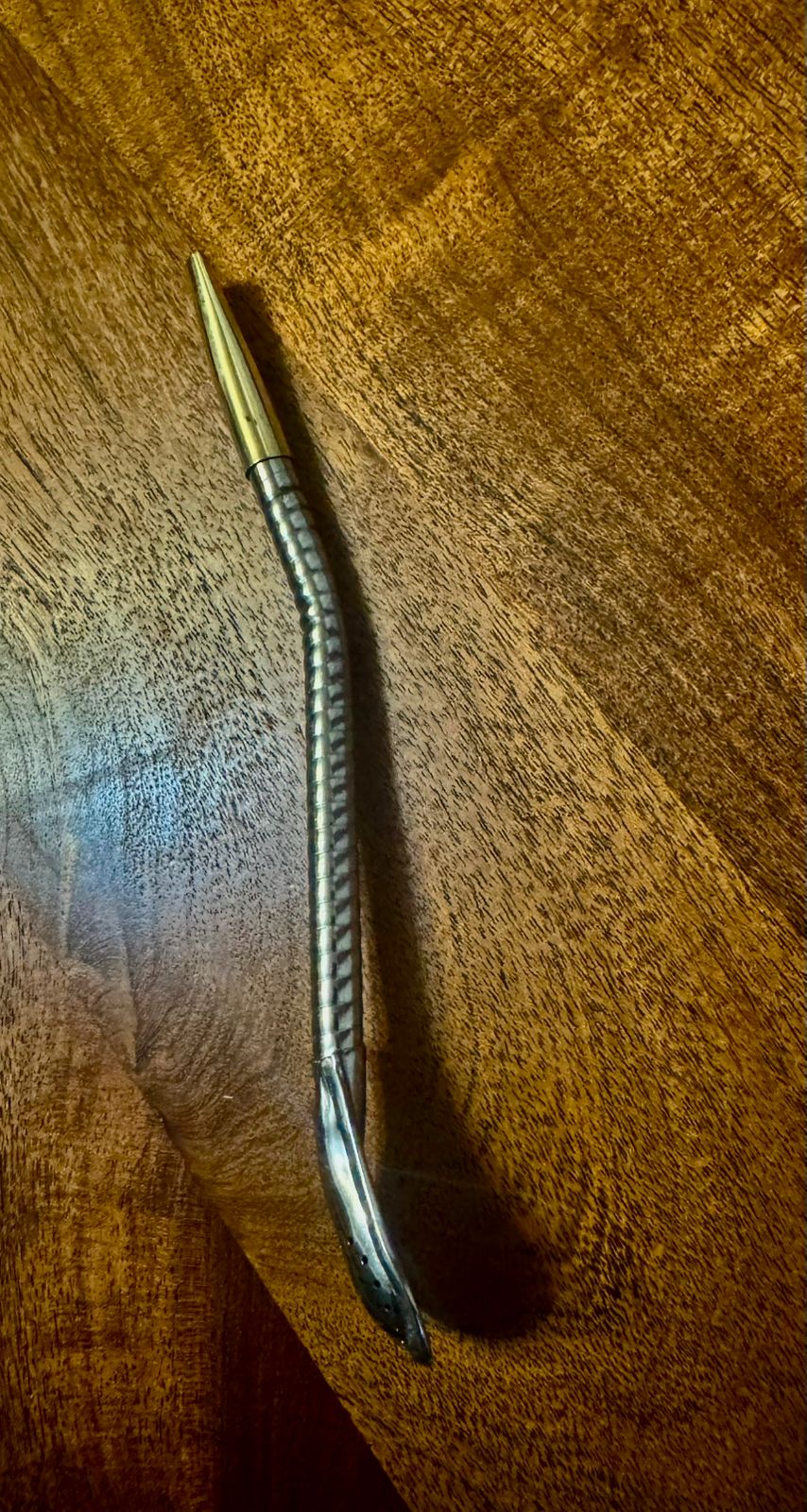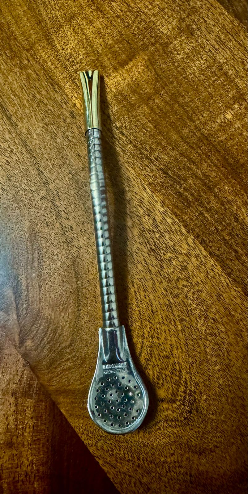 Bombilla Pico semi curvo de acero inoxidable cincelado pico dorado, pala mediana. 17.5×7