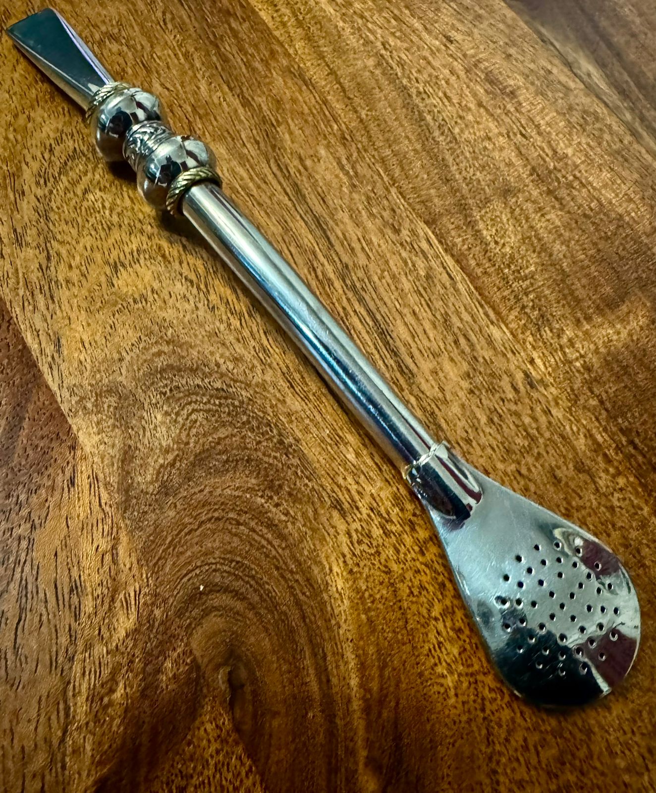 Bombillón Premium de Alpaca pala Uruguaya, doble esfera, ideal para yerba de molienda fina o cualquier otra desde ya. Hecha en material compacto doble cuerpo.