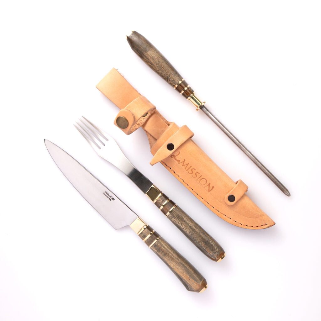 Nuestros cuchillos son realizados en Entre Ríos, Argentina. Utilizamos acero inoxidable, al agua, 420 molibdeno vanadio español, de una dureza similar al acero 440 o quirúrgico, pero con la ductilidad de ser afilado con chaira o piedra. Encabados en madera Guayubira o Asta de ciervo de volteo. Templado, revenido, pulido y afilado de manera artesanal. Las vainas de cuero diseñadas especialmente para cada modelo con protección de costuras en el filo.