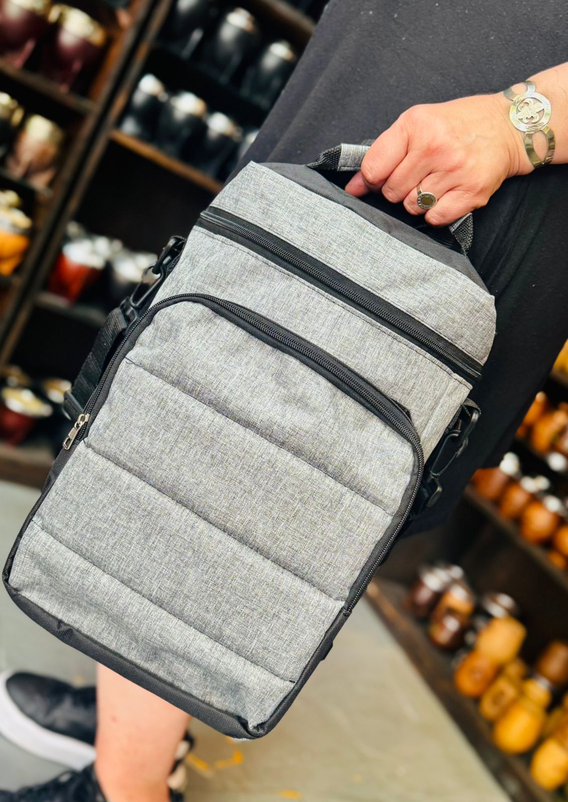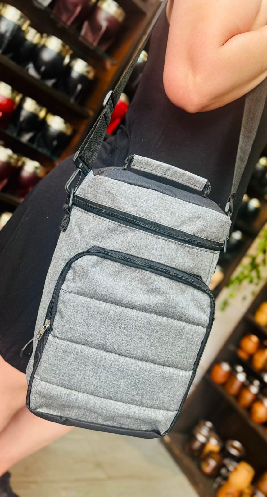 Morral Matero Gris Yelton, ideal para transporte de equipo de mate, con sujeto termo de hasta 1,5Litros. Cómodo, duradero y práctico.