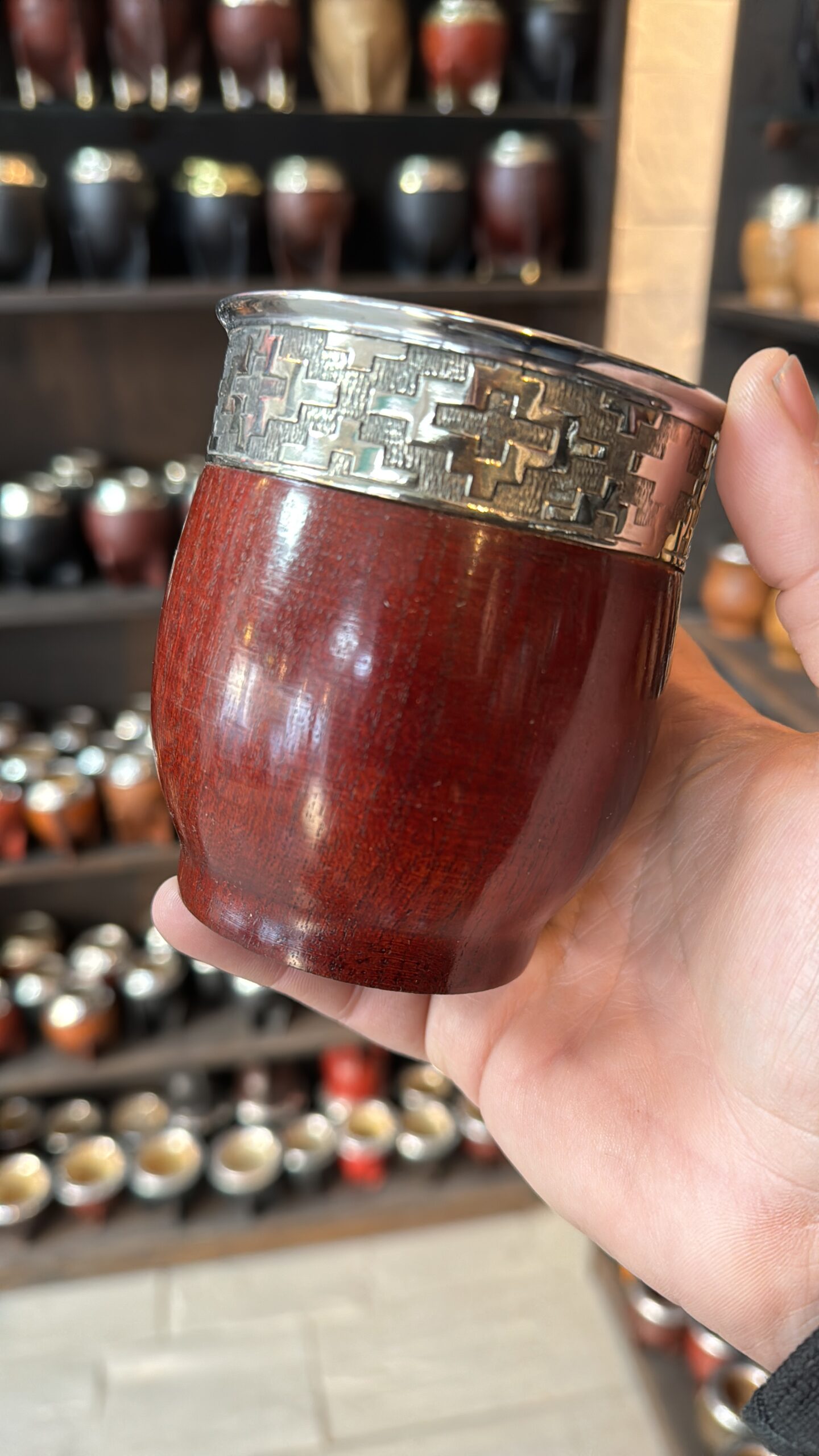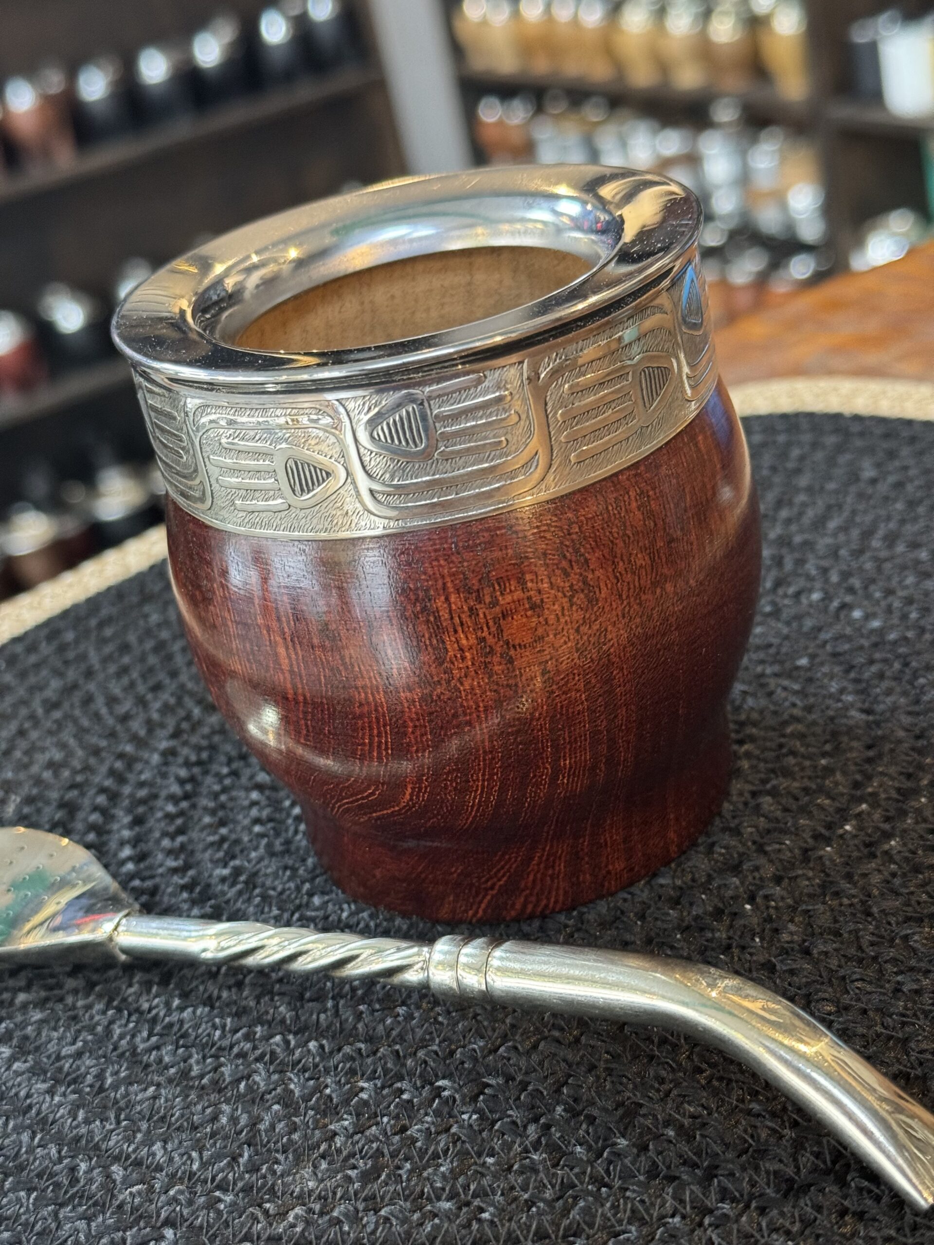 Mate Imperial Premium de algarrobo con fleje de alpaca, terminación pulida y virola de acero, Consultar dibujos de flejes disponibles antes de comprar.