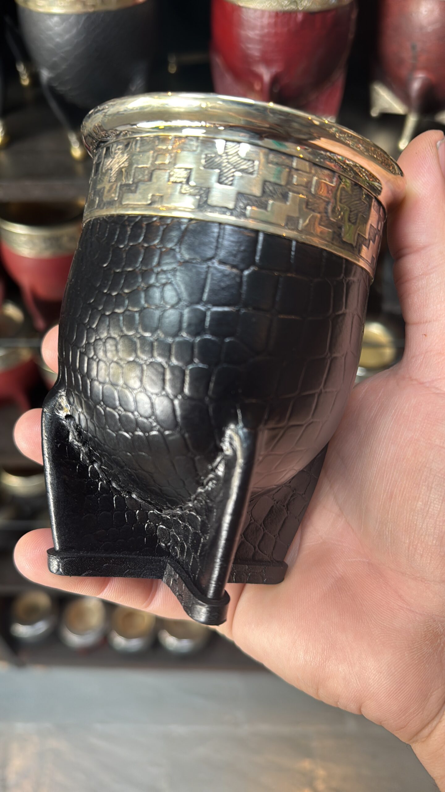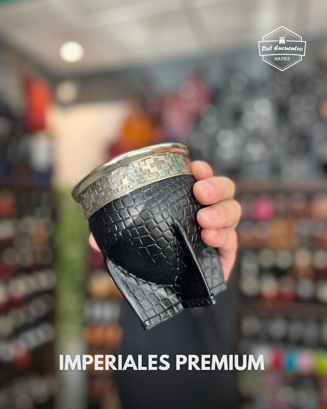 Mate imperial Premium, cuero crocco color blanco, uruguayo, con calabaza brasilera, fleje y virola de alpaca pura, costura uruguaya. Consultar dibujos de flejes disponibles antes de comprar.
