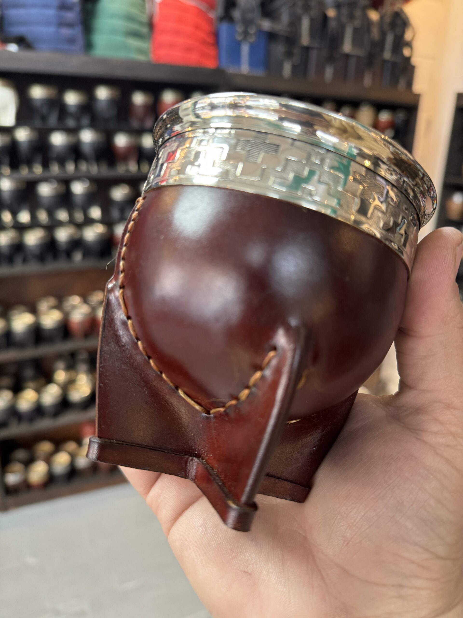 Imperial Premium Cuero liso pulido, con calabaza brasilera, costura uruguaya de puntos continuos reforzada, con virola y fleje de alpaca pura y de vuelo, es un mate increíble con estilo y detalle de los mejores artesanos en mates. Consultar dibujos de flejes disponibles antes de comprar.