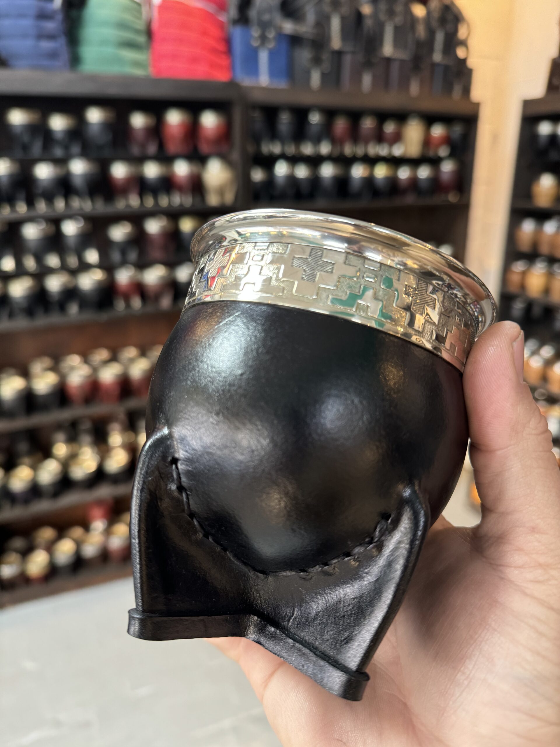 Imperial Premium Cuero liso pulido, con calabaza brasilera, costura uruguaya de puntos continuos reforzada, con virola y fleje de alpaca pura y de vuelo, es un mate increíble con estilo y detalle de los mejores artesanos en mates. Consultar dibujos de flejes disponibles antes de comprar.