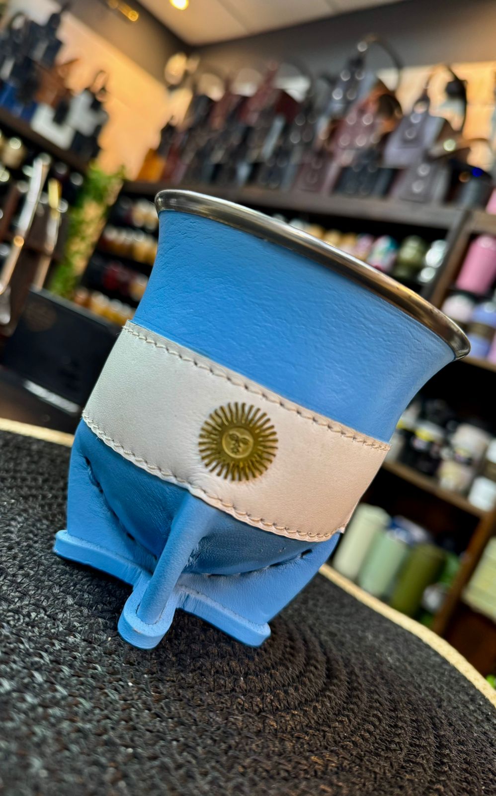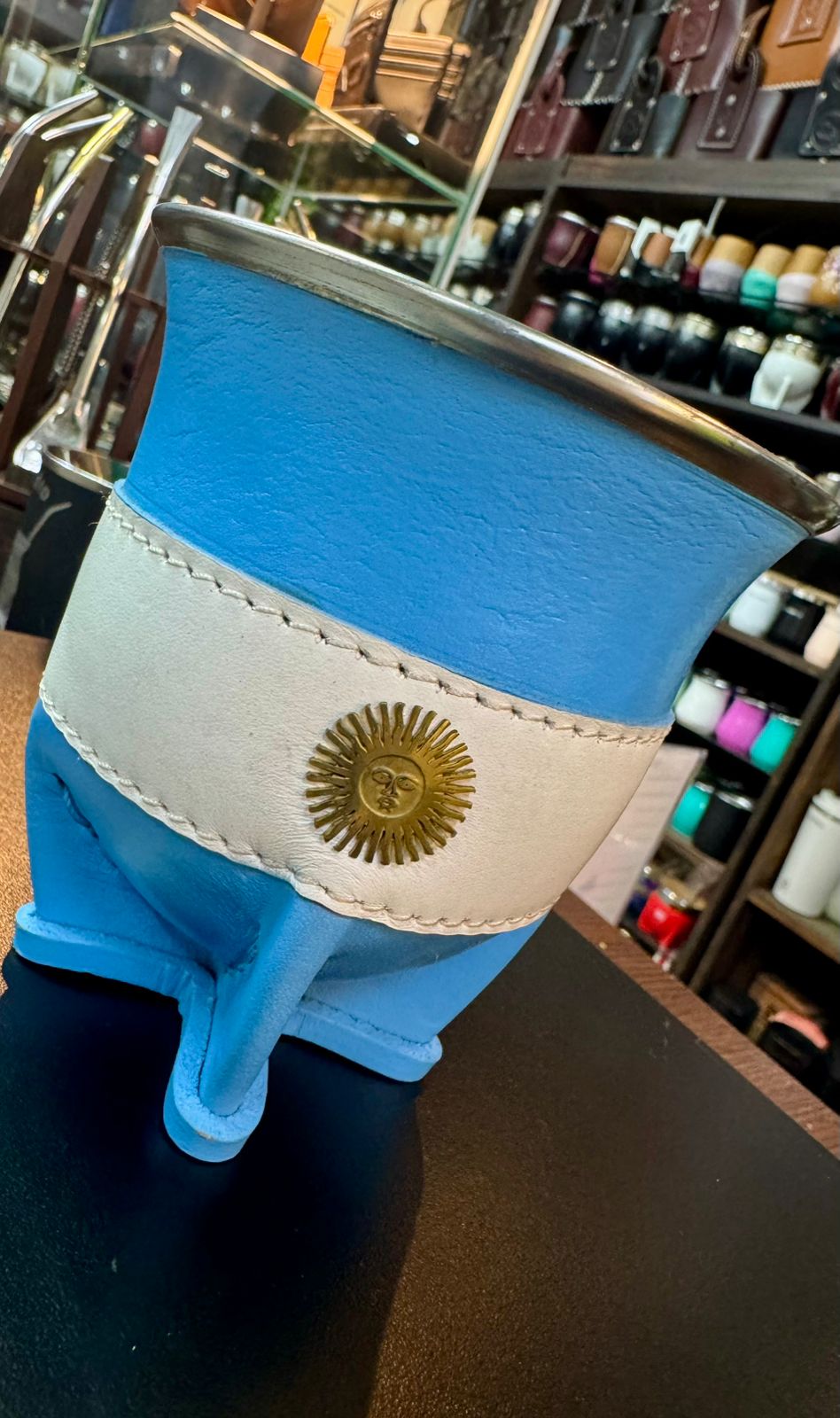 Mate Camionero Argentina Doble cuero, de calabaza, con costura reforzada y dije del sol de mayo en bronce, virola de acero. un mate único y fuerte por su terminación y materiales.