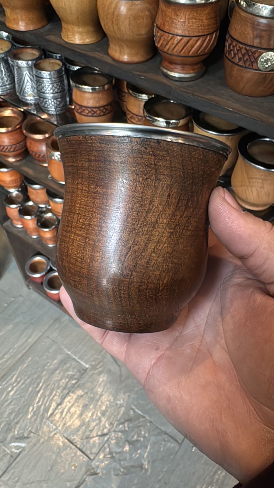 Mate camionero de algarrobo, color Marrón encerado con virola de acero lisa.