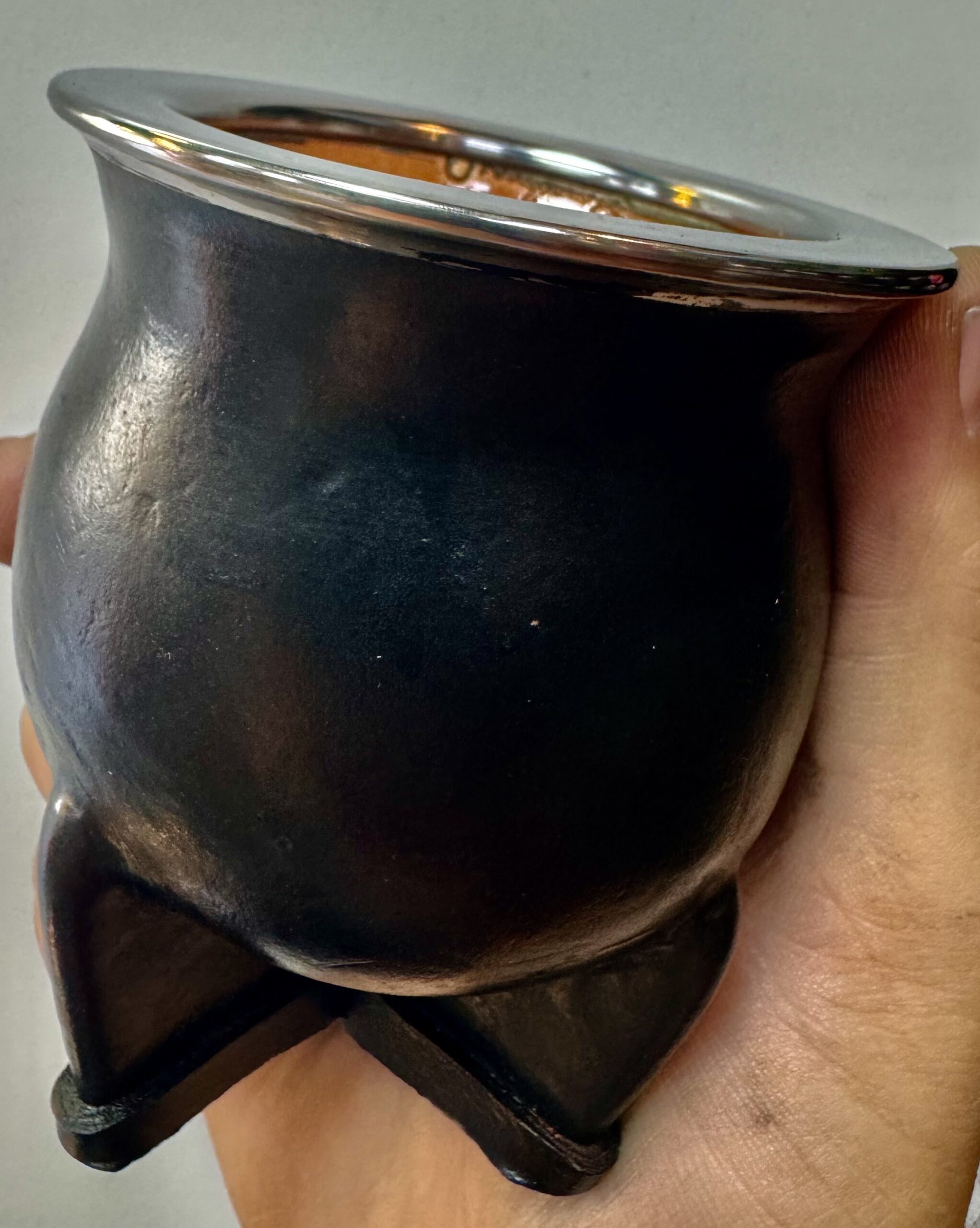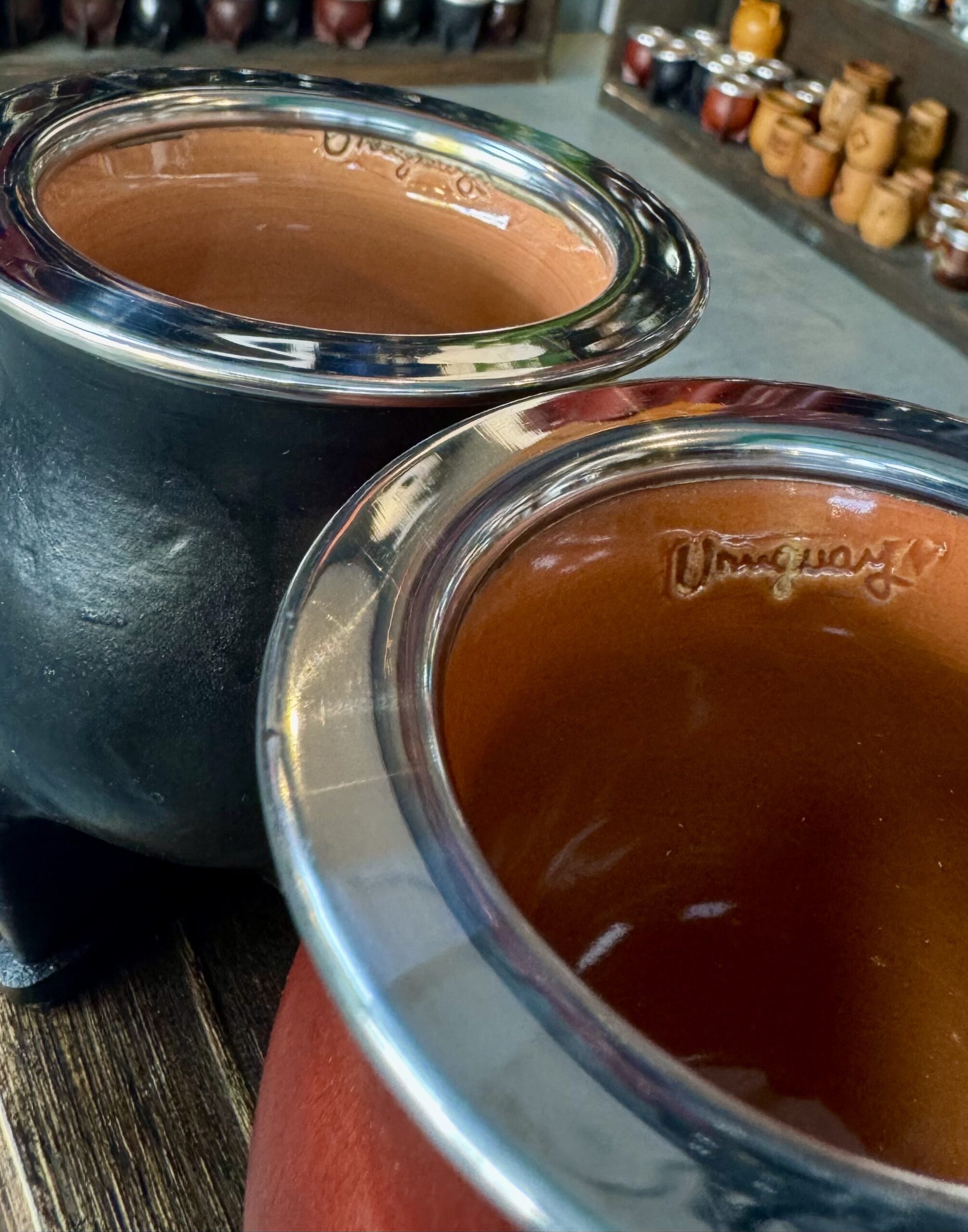 Mate Camionero Uruguayo Interior de cerámica forrado en cuero, costura uruguaya reforzada, con virola de acero.