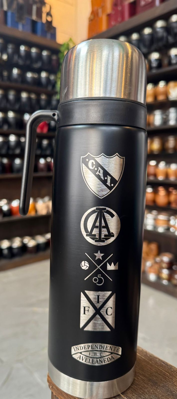 Termo Media manija Personalizado laser Independiente 1L. Termo genérico con pico matero.